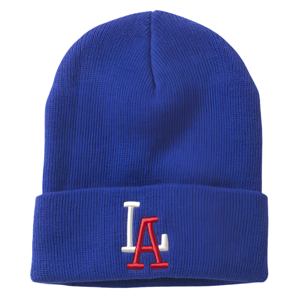 Adult beanie with cuff, fine gauge super stretch knit fit, 12" tall with embroidered logo detail.