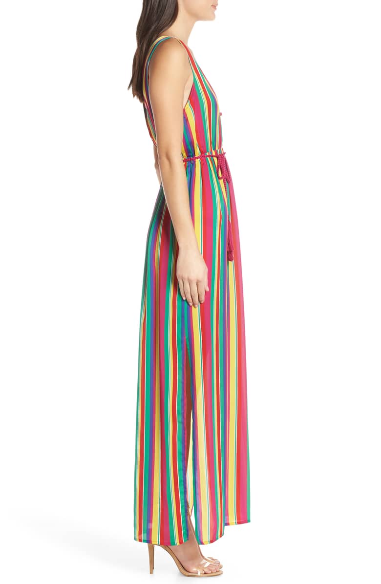 Step out for spring in a bold striped rainbow maxi dress styled with a braided belt, thigh-high slits and a keyhole plunge neckline.