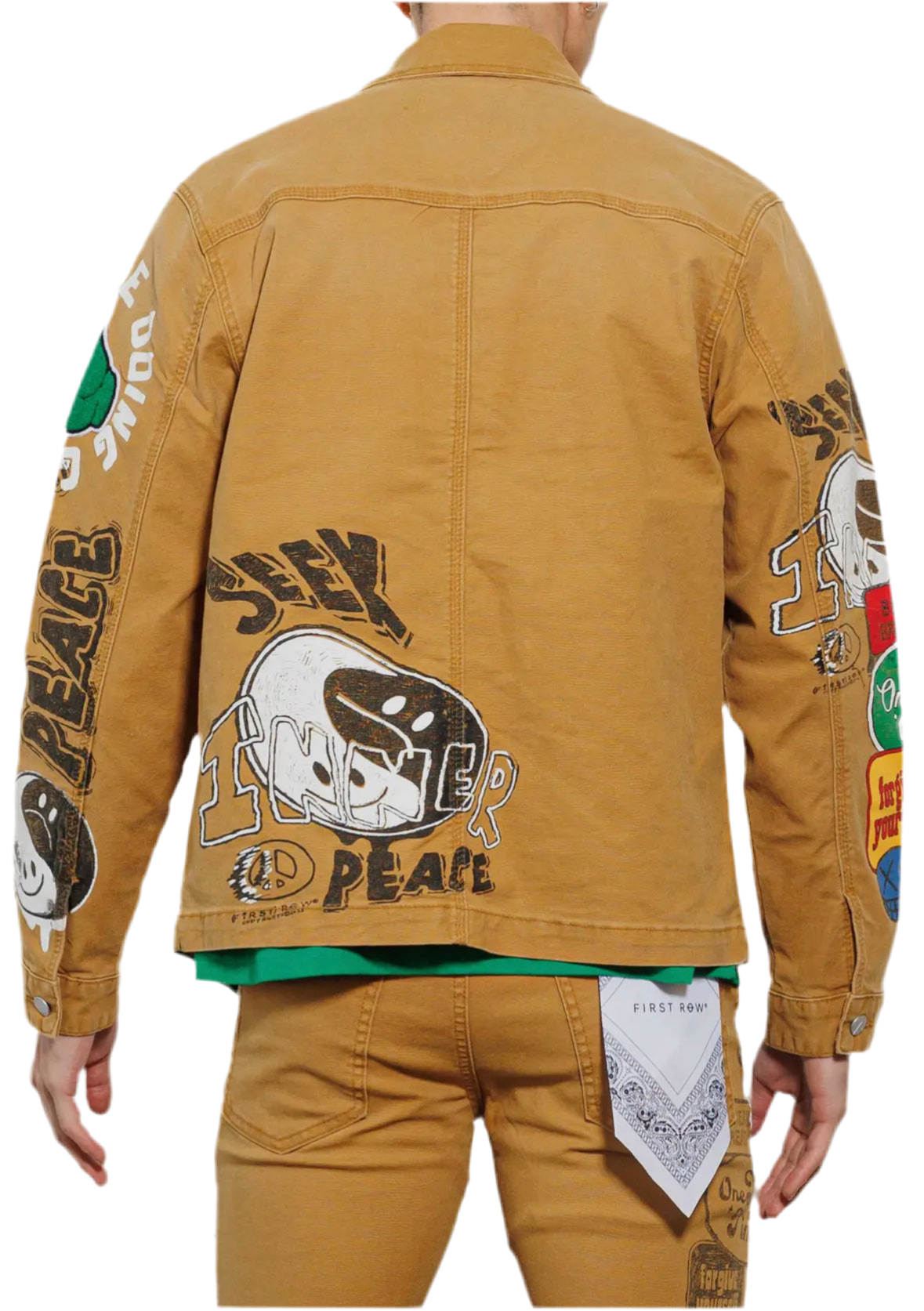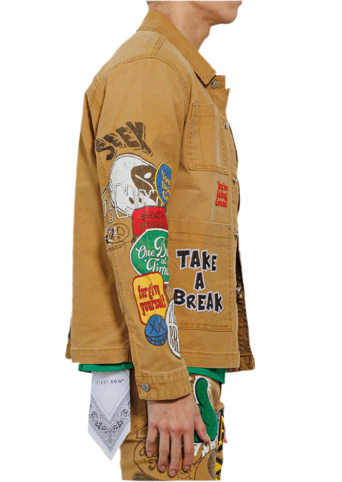 A graphic workwear jacket featuring all over patches, graphic prints, a chest & front pockets and a button down closure.
