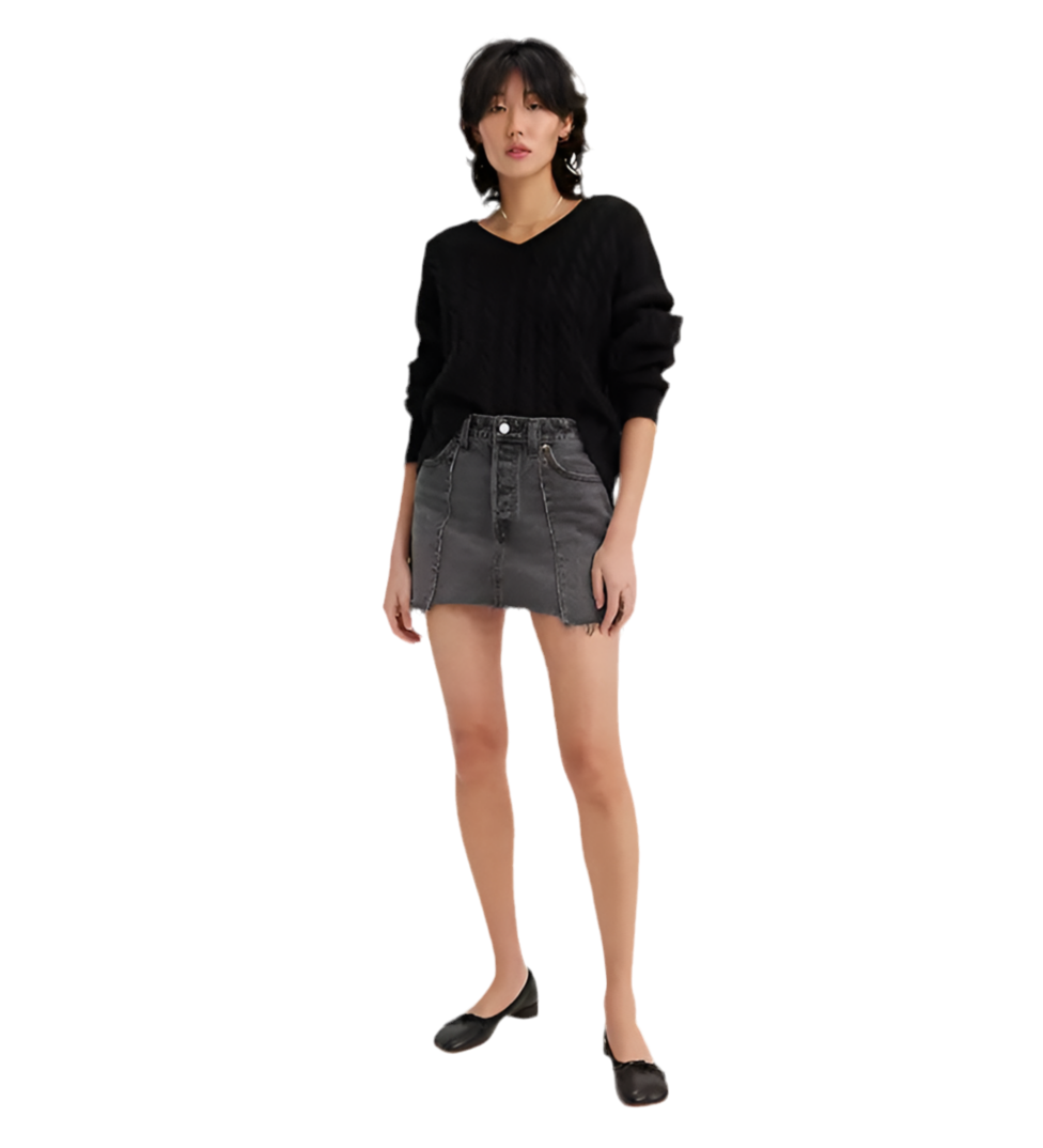 This raw-hem skirt cut from nonstretch denim looks great any day of the week with a chic dark wash, button fly and leggy length.
