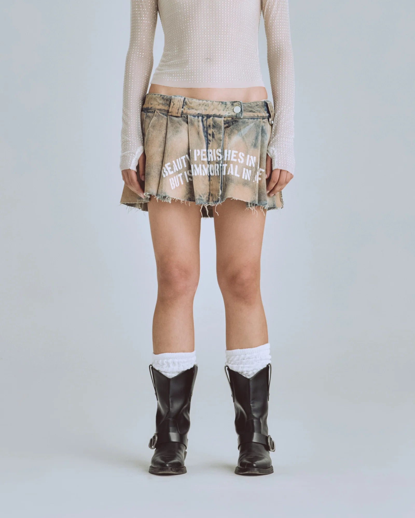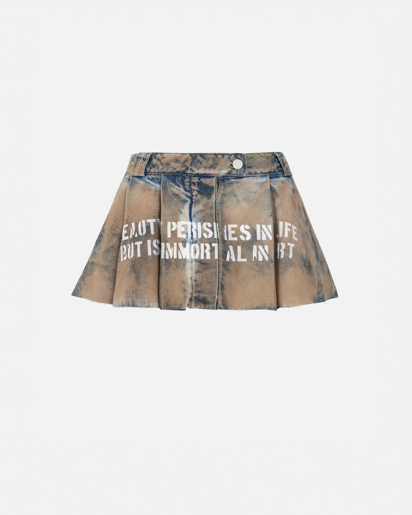 Dirty Blue Mini Pleated Skirt, made of 100% cotton fabric (12,5 onz), intervened with white flat plastisol print on the front and back.